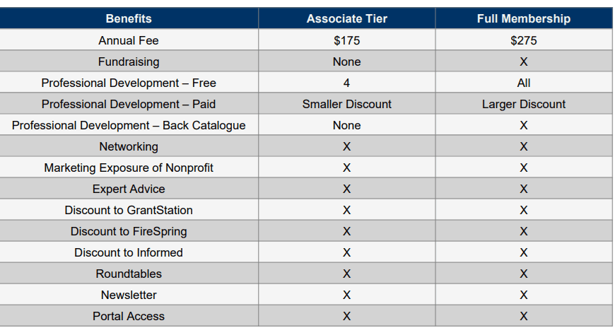 No two nonprofits are the same, so we’ve designed our membership tiers to meet you where you are. Below is our chart of benefits to help you learn the difference between each tier to choose which is the best fit for your organization.